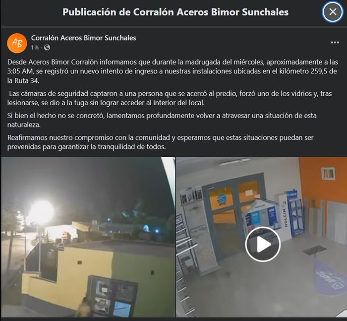 Durante la madrugada del miércoles, alrededor de las 3:05 AM, se registró un nuevo intento de ingreso a las instalaciones de Aceros Bimor Corralón, ubicadas sobre la Ruta Nacional 34, a la altura del kilómetro 259,5.