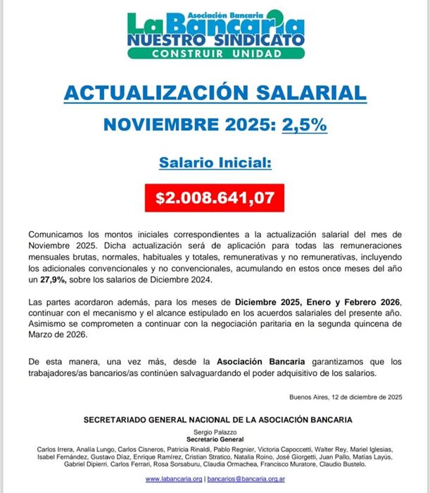 💵 Con este ajuste, el salario inicial bancario quedó fijado en $2.008.641, estableciendo un nuevo piso salarial que refleja el impacto acumulado de los aumentos logrados durante el año.