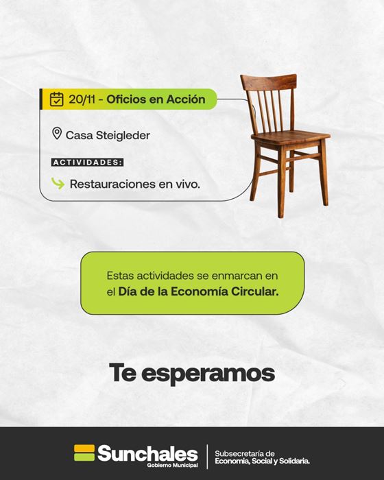 En el marco del Día de la Economía Circular, la Subsecretaría de Economía Social y Solidaria invita a toda la comunidad a participar de “Sunchales Circular: Reinicia”, una propuesta que busca promover hábitos sostenibles a través de actividades prácticas, talleres y experiencias comunitarias.