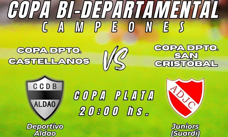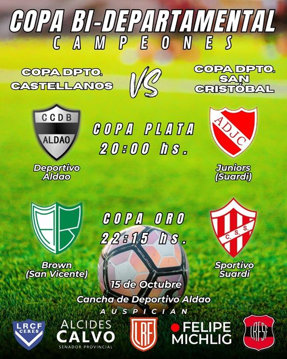 Desde la oficina del Senador Provincial Alcides Calvo se invita a la comunidad a participar y disfrutar de una verdadera fiesta del fútbol regional, el próximo miércoles 15 de octubre se desarrollará la primer edición de la Copa Bi-Departamental, propulsado por Calvo y Michlig junto a la Liga Rafaelina y Ceresina de Fútbol, donde, la cancha del Club Deportivo Aldao será la sede de dichos encuentros, siendo dos finales en formato de partido único; la Final de Plata: a las 20:00 hs, donde Deportivo Aldao (campeón de Plata de la Copa Departamento Castellanos) se medirá ante Asociación Deportiva Juniors de Suardi (campeón de Plata de la Copa Departamento San Cristóbal); Final de Oro: a las 22:15 hs, será el turno de los campeones máximos, con el cruce entre Club Brown de San Vicente (campeón de Oro de la Copa Departamento Castellanos) VS Sportivo Suardi (campeón de Oro de la Copa Departamento San Cristóbal).