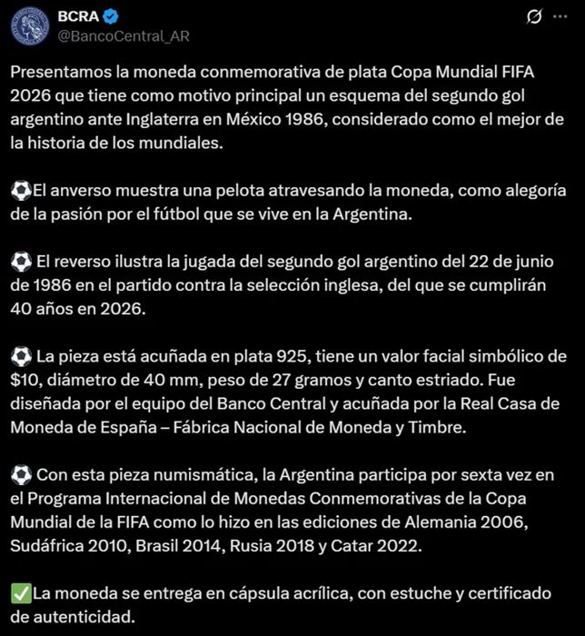 El Banco Central de la República Argentina (BCRA) presentó una moneda conmemorativa de plata en honor a la Copa Mundial de la FIFA 2026, pero el lanzamiento se vio opacado por una fuerte polémica: la pieza se inspira en el segundo gol argentino a Inglaterra en México 1986, aunque no menciona en ningún momento a su autor, Diego Armando Maradona.