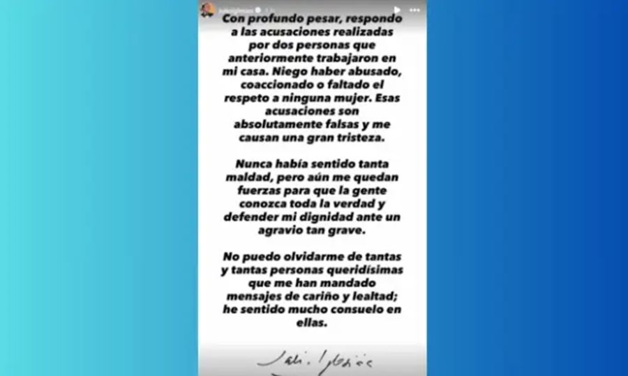 “Con profundo pesar respondo a las acusaciones realizadas por dos personas que anteriormente trabajaron en mi casa. Niego haber abusado, coaccionado o faltado el respeto a ninguna mujer. Esas acusaciones son absolutamente falsas y me causan una gran tristeza. Nunca había sentido tanta maldad, pero aún me quedan fuerzas para que la gente conozca toda la verdad y defender mi dignidad ante un agravio tan grave”, expresó el artista.