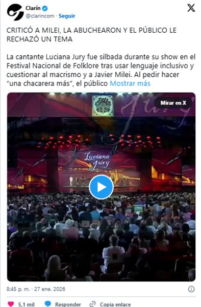 Un momento incómodo y cargado de tensión se vivió en el Festival Nacional de Folklore de Cosquín, cuando la cantante y compositora Luciana Jury, sobrina de Leonardo Favio, fue abucheada por el público tras realizar comentarios políticos desde el escenario.