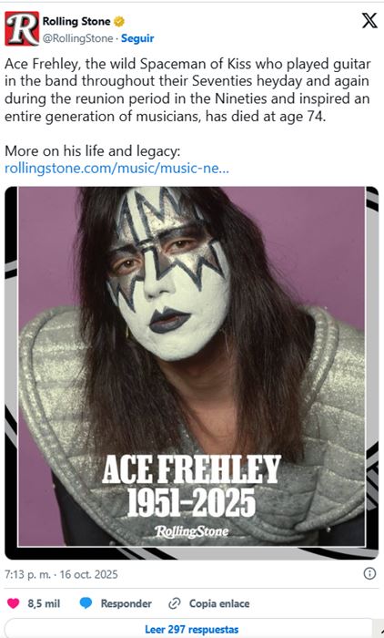 Ace Frehley, histórico guitarrista de Kiss y músico influyente del género, murió este jueves a la edad de 74 años.