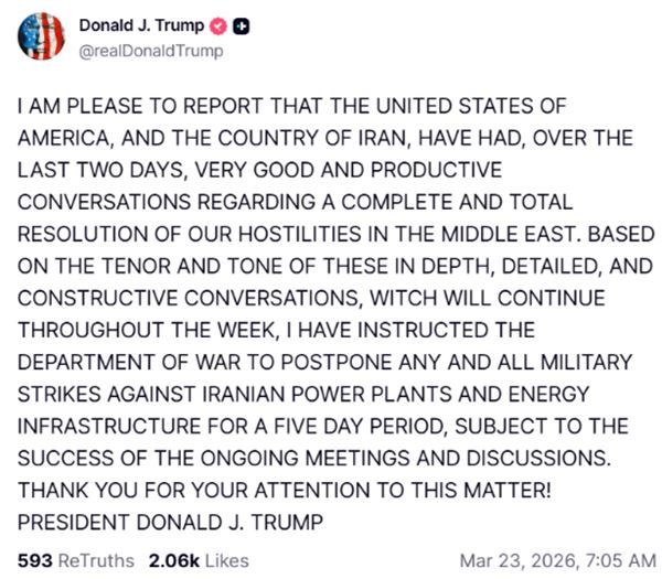 La decisión fue comunicada a través de su red social Truth Social, donde aseguró que en las últimas 48 horas se llevaron adelante “conversaciones muy buenas y productivas” con autoridades iraníes.