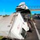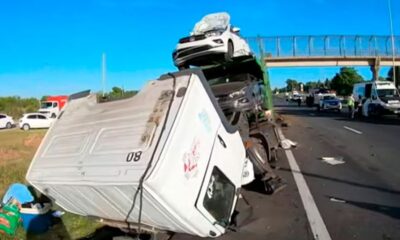Un camión que transportaba autos chocó con una camioneta. Tras la colisión, el camión impactó la pasarela, que cayó sobre la camioneta y murieron sus ocupantes....