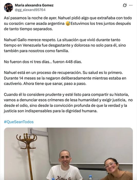 La esposa de Gallo compartió en sus redes sociales una imagen de ese momento tan esperado en el Edificio Centinela de la Gendarmería Nacional, donde aún se está recuperando físicamente tras su regreso al país. Según relató, el gendarme pidió específicamente “carne asada argentina”, un plato que había extrañado profundamente durante su largo cautiverio.