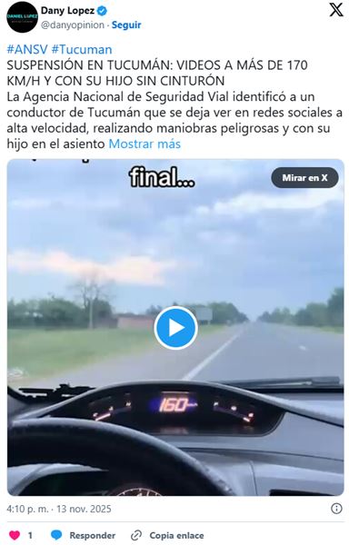 La Agencia Nacional de Seguridad Vial (ANSV) revocó la licencia de conducir de un vecino de Bella Vista, Tucumán, luego de que se viralizaran en redes sociales varios videos donde se lo ve manejando a altísimas velocidades y con su hijo menor sin cinturón de seguridad en el asiento delantero.