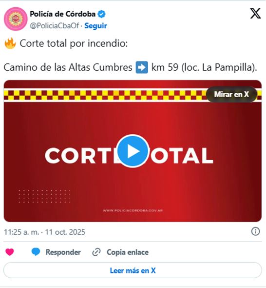 Pasadas las 11.30, la Policía Caminera informó que se procedió al corte total de la ruta que comunica a la provincia con el Valle de Traslasierra.