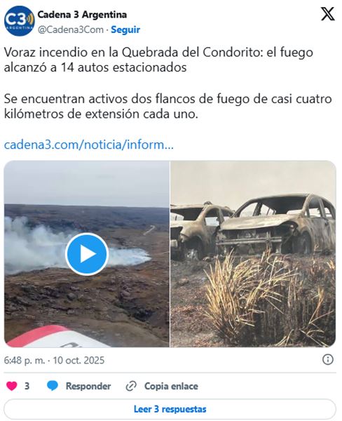 El secretario de Gestión de Riesgo Climático, Roberto Schreiner, explicó a Cadena 3: «Durante la mañana del viernes, cerca del mediodía, un auto que estaba entrando al Parque Nacional Quebrada del Condorito se prendió fuego. Ese fuego estaba cerca de las banquinas y rápidamente entraron en combustión los pastizales».