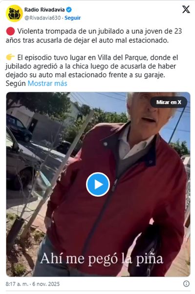 Un violento episodio conmocionó a los vecinos de Villa del Parque, en Buenos Aires: un jubilado le pegó una trompada en la cara a una joven de 23 años luego de acusarla de haber estacionado mal frente a su garaje.