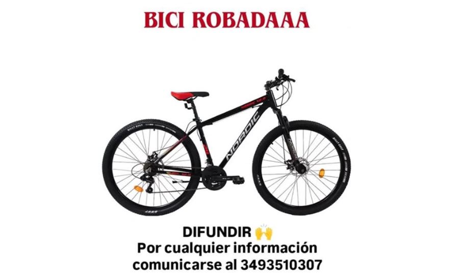 Una mujer de 29 años denunció el robo de su bicicleta Nordic rodado 29, negra y roja con calcomanía de Ronchibikes, la cual había dejado en el patio común de su domicilio en Av. Independencia al 100.