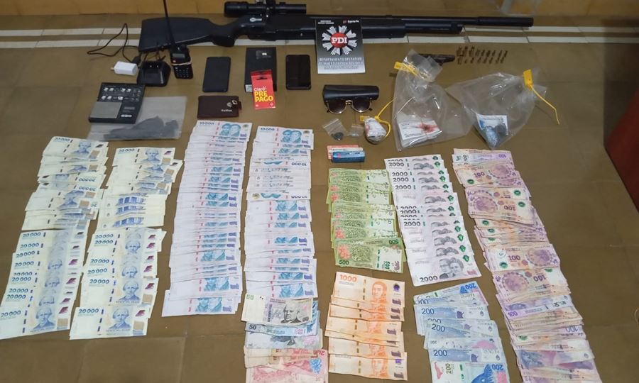 Como resultado del procedimiento, los agentes secuestraron un trozo compacto de cocaína (35,7 g), picadura de marihuana (67 g), varios recortes de nylon para fraccionamiento, una balanza digital sin marca visible, dos teléfonos celulares, un equipo de handy banda ancha, un rifle de aire comprimido calibre 5,5 con mira telescópica, un arma de fuego calibre .22 corto, vainas servidas y sin accionar de varios calibres y $2.744.740 en efectivo.