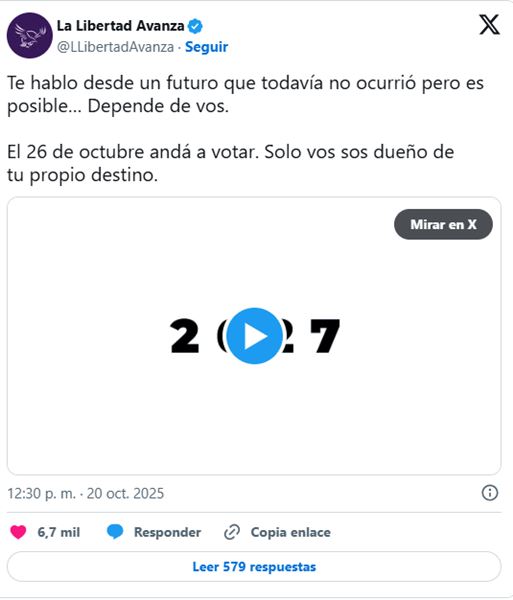 “Volvé, estás en el 2025 y este futuro todavía no llegó, pero es posible. Depende de vos. El 26 de octubre andá a votar. Solo vos sos dueño de tu propio destino”, cierra el corto.