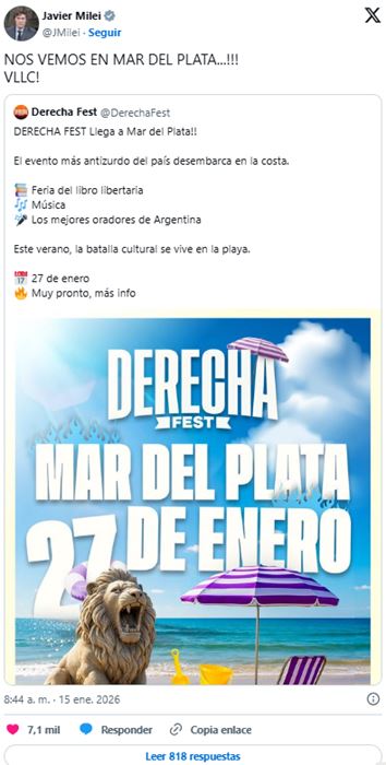 La presencia de Milei genera expectativa tanto en el ámbito político como entre el público del festival, que año tras año convoca a miles de personas y se convierte en uno de los eventos culturales más importantes del verano argentino.