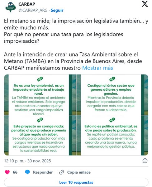 Además, remarcó que no existe hoy un método práctico, económico ni verificable para medir de manera individual el metano emitido por cada animal, lo que volvería inviable la aplicación de la tasa.
