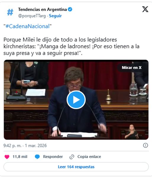 El discurso estuvo atravesado por fuertes intercambios con la oposición. Milei calificó al kirchnerismo como “el gobierno más corrupto de la historia”, cuestionó la justicia social al afirmar que “es un robo” y responsabilizó a gobiernos anteriores por crisis económicas pasadas.