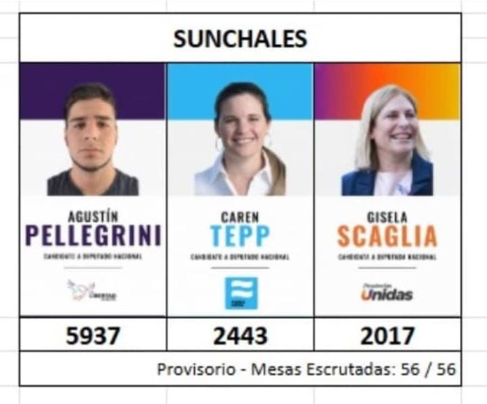En segundo lugar se ubicó Caren Tepp de Fuerza Patria, con 2.443 votos, mientras que Gisela Scaglia de Provincias Unidas alcanzó 2.017 sufragios, completando el podio local.