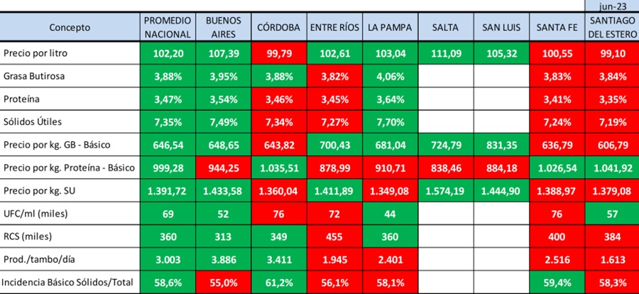 De acuerdo al informe, hay tres provincias que están en rojo respecto al promedio nacional de precios: Córdoba, Santa Fe y Santiago del Estero. En ese marco, entre las provincias lecheras hay cinco con saldo positivo respecto al promedio: Buenos Aires, Entre Ríos, La Pampa, Salta y San Luis. En el caso de Salta, donde la producción es muy limitada, prácticamente de subsistencia, los precios promedio son de 111,09 pesos por litro.