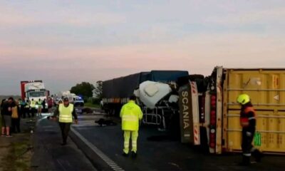 Según las primeras informaciones, dos camiones chocaron y uno de ellos terminó volcado, esparciendo su carga sobre todo el asfalto. El impacto fue de tal magnitud que uno de los conductores quedó atrapado dentro de la cabina y tuvo que ser rescatado por Bomberos.