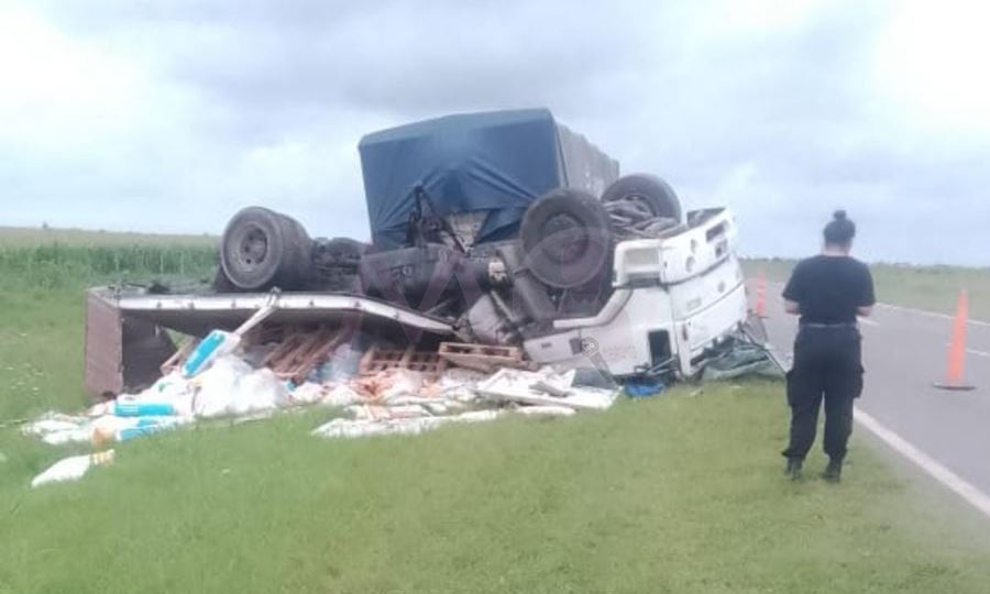 👉 Por causas que se tratan de establecer, un camión protagonizó un vuelco en solitario, quedando completamente dado vuelta sobre la banquina, con importantes daños materiales y carga esparcida en el lugar, según se observa en la escena.