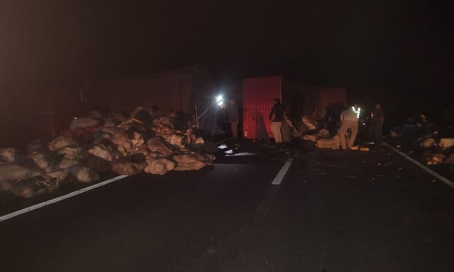 Un camión Volvo con acoplado, cargado con zapallos y calabazas, protagonizó un fuerte accidente en la Ruta Provincial Nº 2, a unos 2 km al norte de La Cabral.