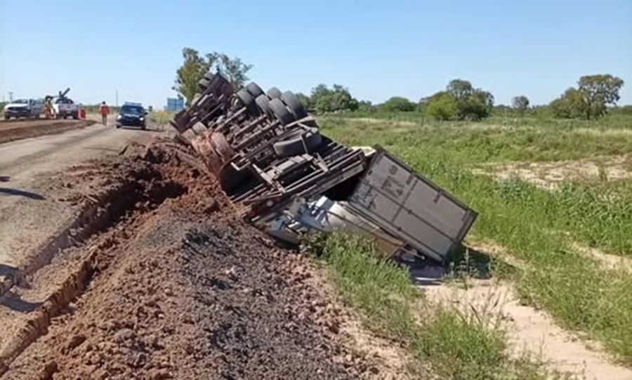 Un camión Scania protagonizó un nuevo incidente vial sobre la Ruta Provincial 4, a la altura de los puentes, donde terminó volcado a un costado del camino.