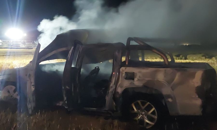 👉 Al llegar a la vera de la Ruta Nacional 34, los equipos visualizaron un resplandor hacia el noroeste. Al acercarse confirmaron lo peor: la camioneta estaba totalmente envuelta en llamas, detenida sobre un rastrojo de trigo y peligrosamente cerca de un sector de cultivo.