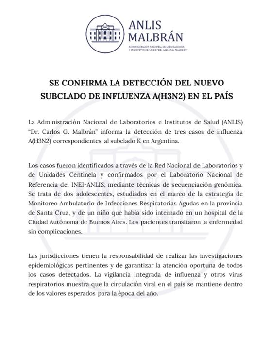 La ANLIS Malbrán confirmó la detección de tres casos de influenza A (H3N2) correspondientes al subclado K, una variante que encendió alertas a nivel internacional por su mayor capacidad de transmisión.