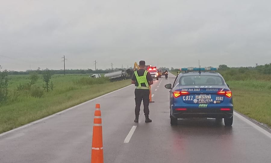 Por causas que aún se investigan, el conductor perdió el control del vehículo mientras circulaba de oeste a este, lo que provocó que el acoplado cisterna volcara sobre la banquina sur, obstruyendo parcialmente la calzada.