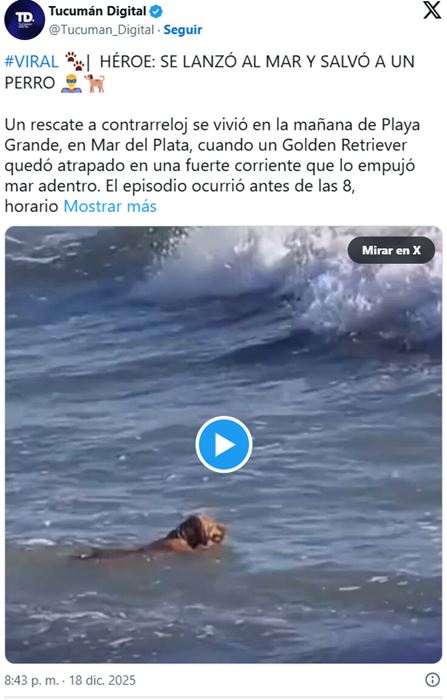 Un acto de valentía espontáneo se volvió viral este miércoles por la mañana en Playa Grande, Mar del Plata. Antes de las 8, cuando no había cobertura de guardavidas, un Golden Retriever quedó atrapado en una fuerte corriente de retorno que lo empujó mar adentro, poniendo en riesgo su vida.